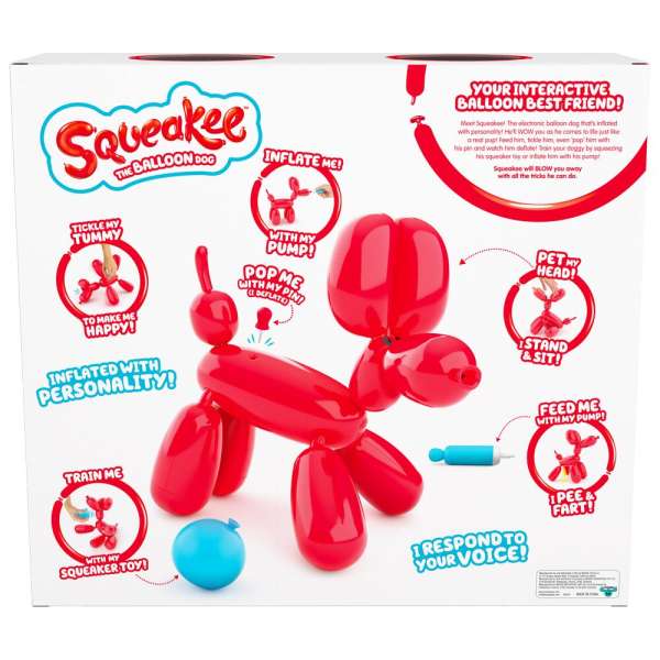 Squeakee interaktif bir köpek ve oyun oynamayı çok seviyor! Bu oyuncu köpek sesinize tepki veriyor, 60’tan fazla ses ve hareket kabiliyetiyle sizi çok eğlendiriyor ve üstelik tıpkı gerçek bir balondan yapılmış gibi görünüyor! Onu mutlu etmek için başını okşar veya karnını gıdıklarsanız oturduğunu veya ayağa kalktığını görebilirsiniz!